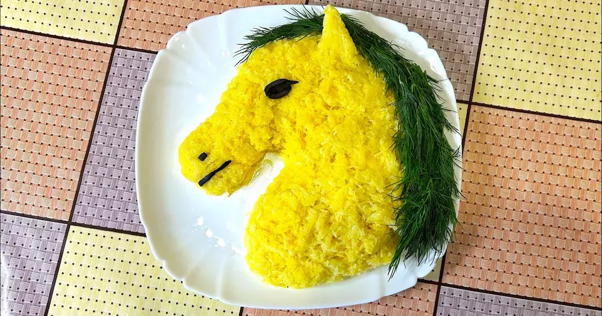лат «Кінь» — символ Нового року 2026 — це святкова страва, яка ідеально підходить для новорічного столу. Завдяки оригінальному оформленню у формі коня та ніжному смаку салат швидко стає головною прикрасою свята. Такий новорічний салат 2026 не лише красиво виглядає, а й з’їдається одразу, пише Смачненьке.